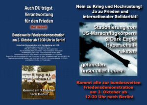 Die Initiative „Nie wieder Krieg – Die Waffen nieder“ organisiert eine große, bundesweite Demonstration am 3. Oktober 2024 in Berlin. Das Motto lautet „Nein zu Krieg und Hochrüstung! Ja zu Frieden und internationaler Solidarität.“