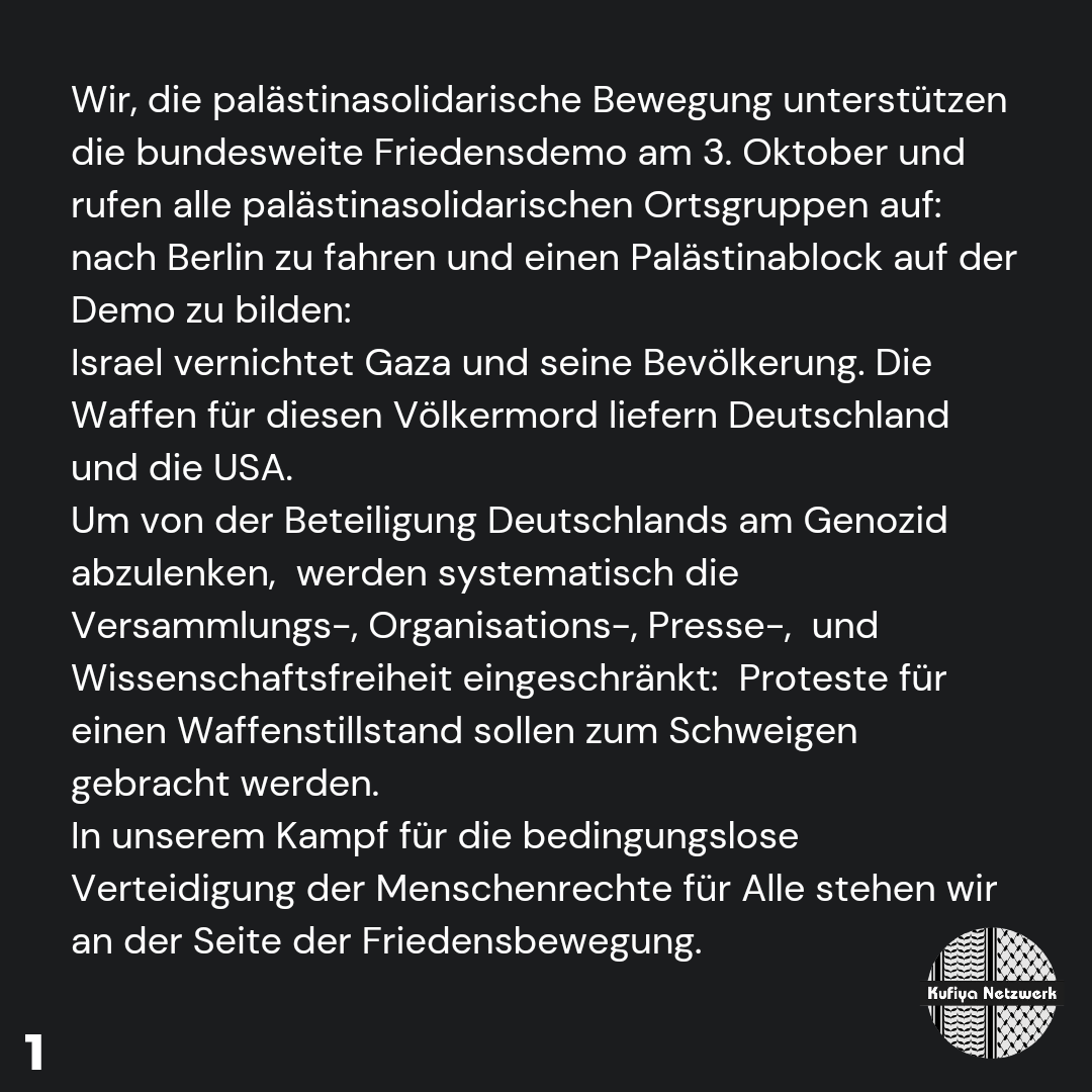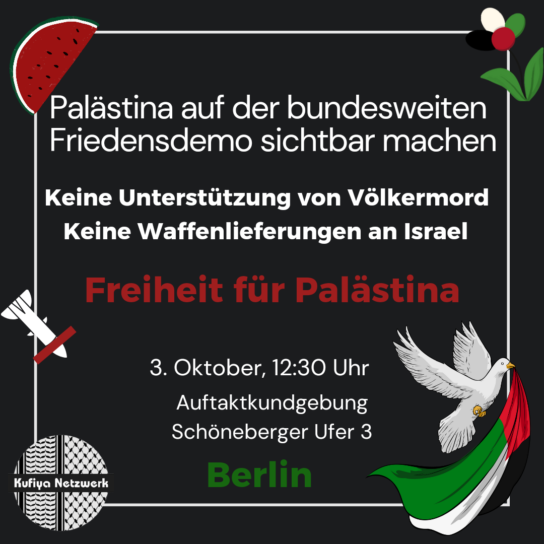 Wir, die palästinasolidarische Bewegung unterstützen die bundesweite Friedensdemo am 3. Oktober und rufen alle palästinasolidarischen Ortsgruppen auf: nach Berlin zu fahren und einen Palästinablock auf der Demo zu bilden: