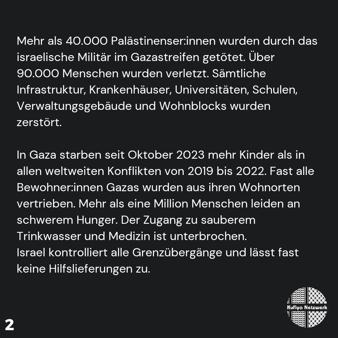 Mehr als 40.000 Palästinenser:innen wurden durch das israelische Militär im Gazastreifen getötet. Über 90000 Menschen wurden verletzt. Sämtliche Infrastruktur, Krankenhäuser, Universitäten, Schulen, Verwaltungsgebäude und Wohnblocks wurden zerstört.