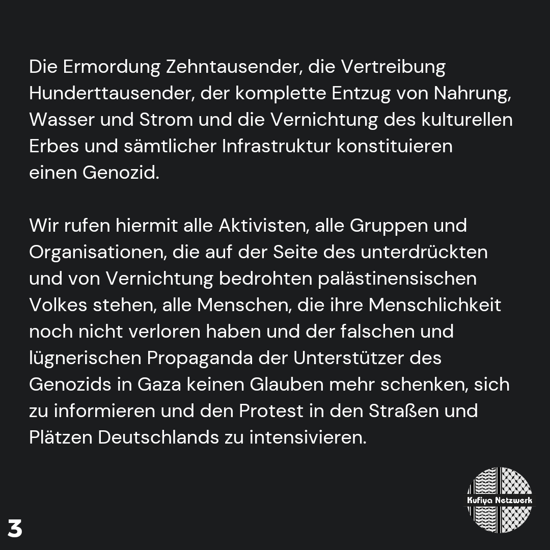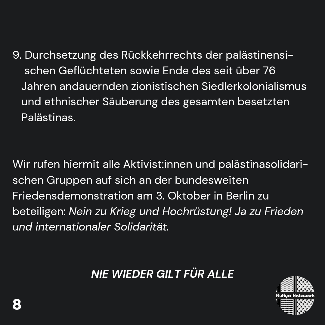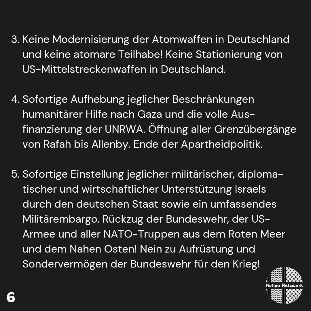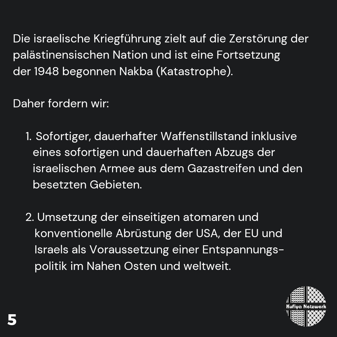- Sofortiger, dauerhafter Waffenstillstand inklusive eines sofortigen und dauerhaften Abzugs der israelischen Armee aus dem Gazastreifen und den besetzten Gebieten.Umsetzung der palästinensischen Forderungen eines dauerhaften gerechten Friedens. Vollständige Aufarbeitung aller begangener Kriegsverbrechen. Reparationen Israels, Deutschlands und weiterer Verbündeter an das palästinensische Volk für die begangenen Verbrechen