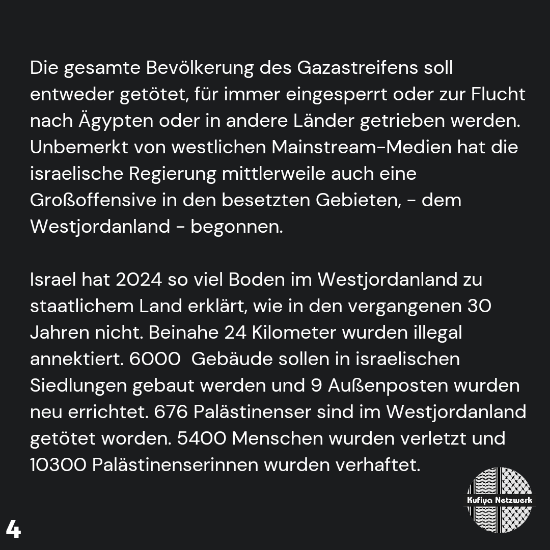 Israel hat 2024 so viel Boden im Westjordanland zu staatlichem Land erklärt, wie in den vergangenen 30 Jahren nicht. Beinahe 24 Kilometer wurden illegal annektiert. 6000 Gebäude sollen in israelischen Siedlungen gebaut werden und 9 Außenposten wurden neu errichtet. 676 Palästinenser sind im Westjordanland getötet worden. 5400 Menschen wurden verletzt und 10300 Palästinenserinnen wurden verhaftet.