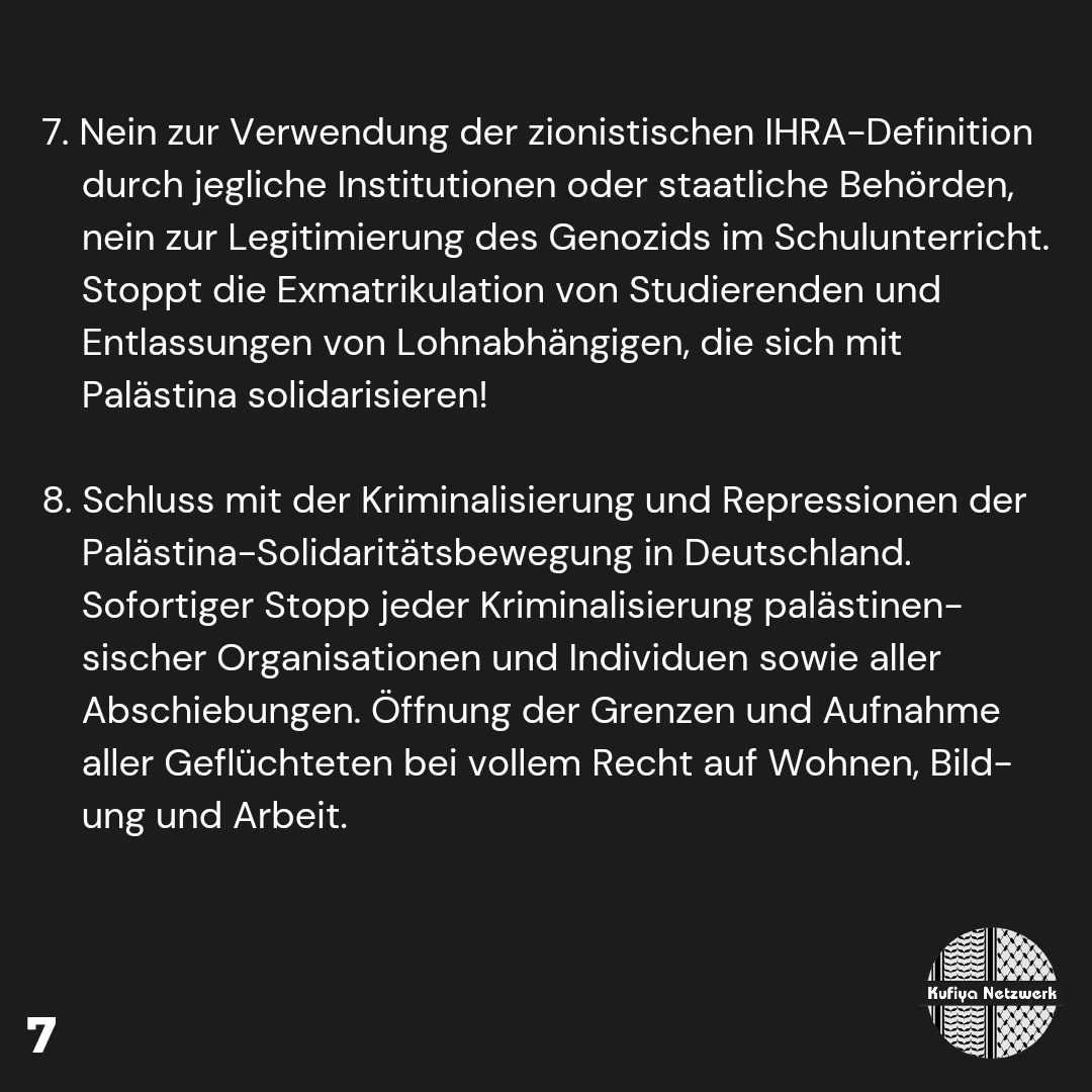 - Nein zu der Verwendung der zionistischen IHRA-Definition durch jegliche Institutionen oder staatliche Behörden, nein zur Legitimierung des Genozids im Schulunterricht. Stoppt die Exmatrikulation von Studierenden und Entlassungen von Lohnabhängigen, die sich mit Palästina solidarisieren!